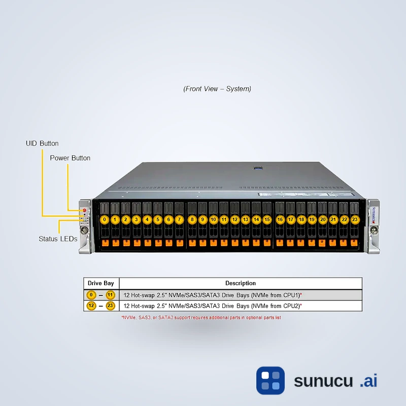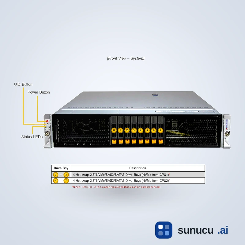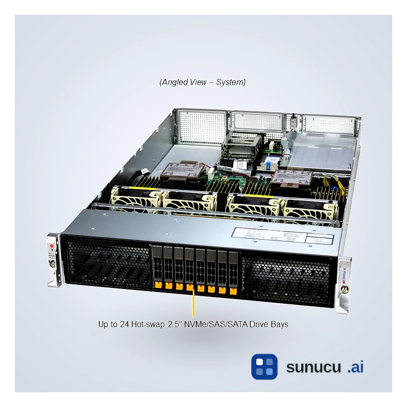 | Depolama | 8x (opsiyonel 16x veya 24x) hot-swap 2.5″ NVMe/SAS/SATA + 2x M.2 NVMe |