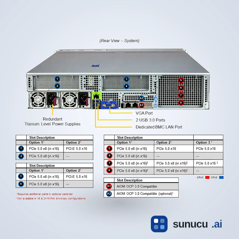 | PCIe | 8x PCIe 5.0 x8 (x16) FHFL + 2x PCIe 5.0 AIOM (OCP NIC 3.0 uyumlu) + 2x M.2 PCIe 5.0 x2 NVMe |